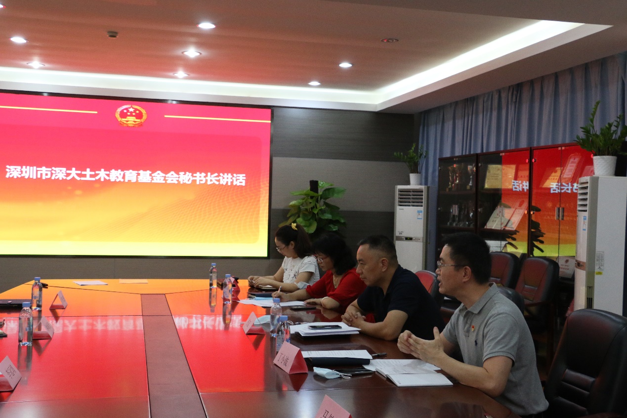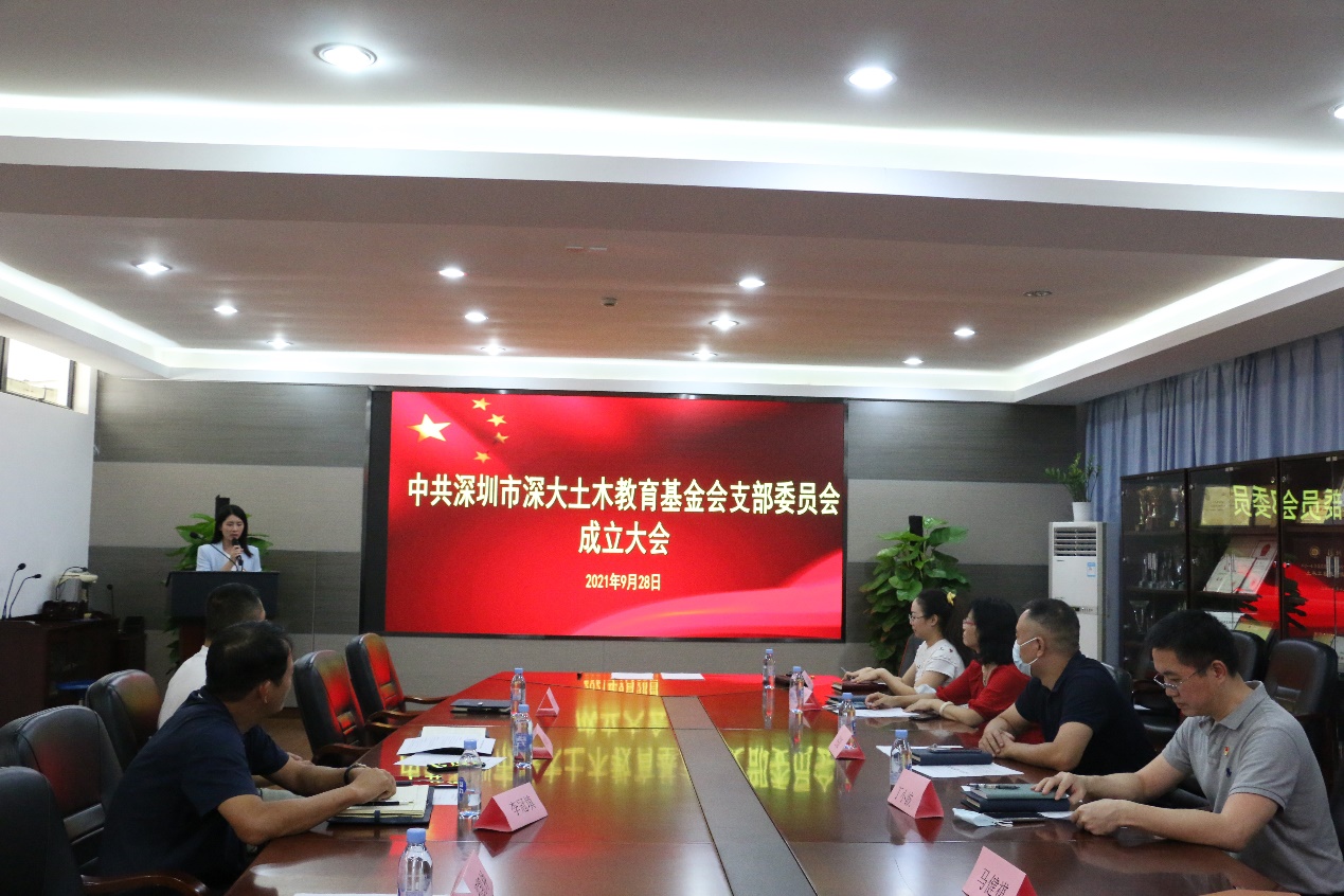 2021年9月28日下午3时,中共深圳市深大土木教育基金会支部委员会成立大会在深圳大学致工楼B401举行,出席本次大会的领导有粤海街道深大社区党委书记任毅同志,粤海街道深大社区工作站副站长廖思华同志,深圳市深大土木教育基金会秘书长丁小波同志,深圳市深大土木教育基金会党支部书记候选人、1996级校友林峰智同志,1995级校友李冠填同志。