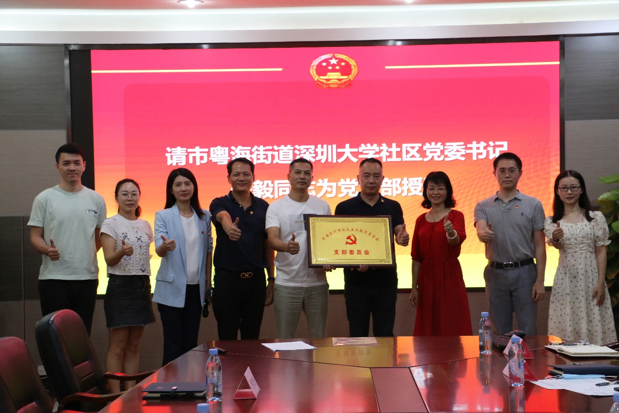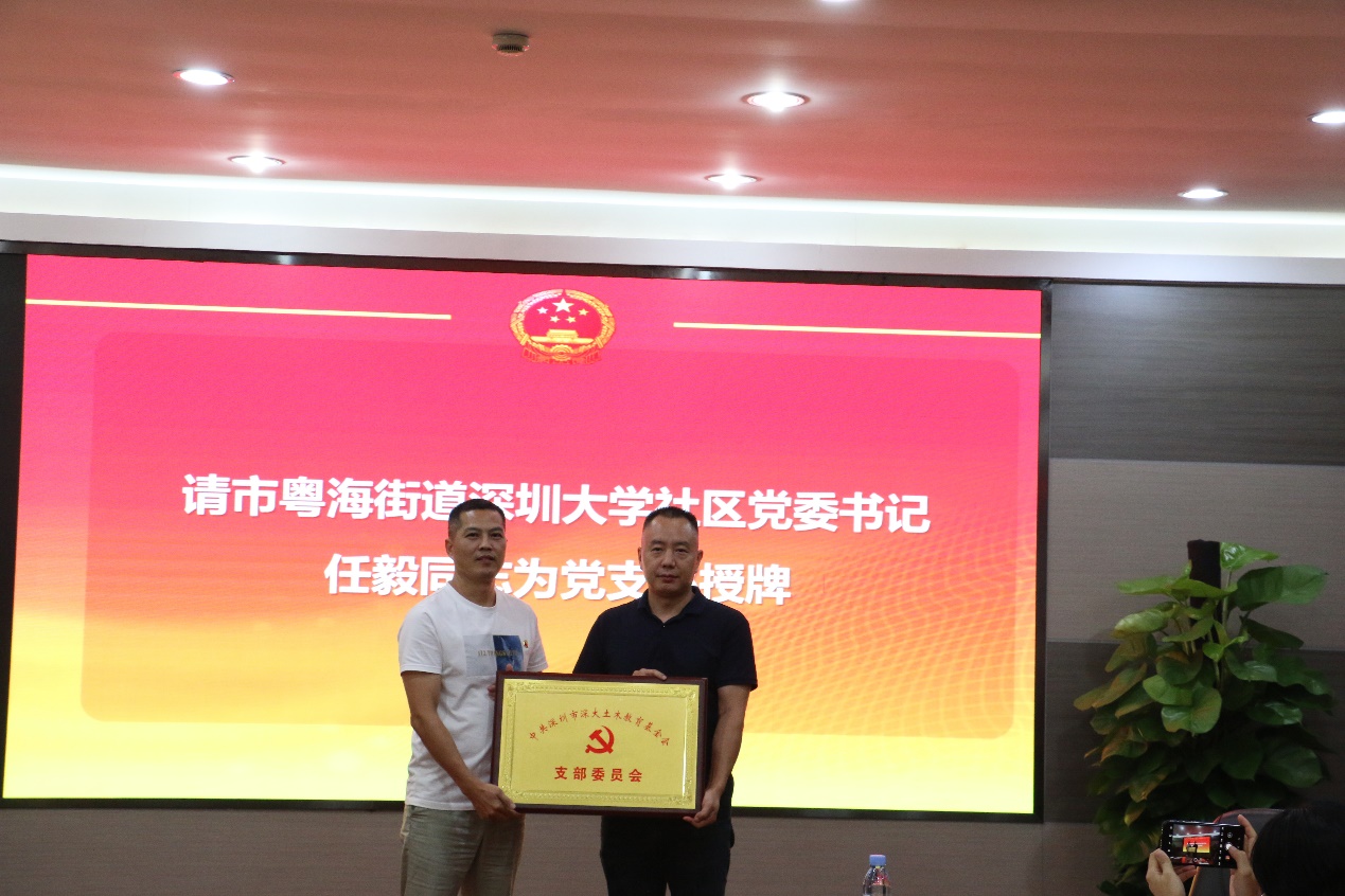 大会上,深圳市粤海街道深大社区党委书记任毅同志为党支部授牌,党支部书记林峰智同志上台接受牌匾。
