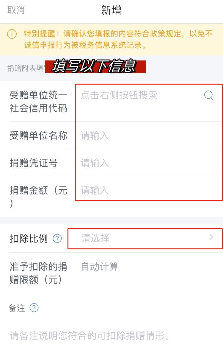 根据捐赠票据添加信息,并选择相应的扣除比例。
