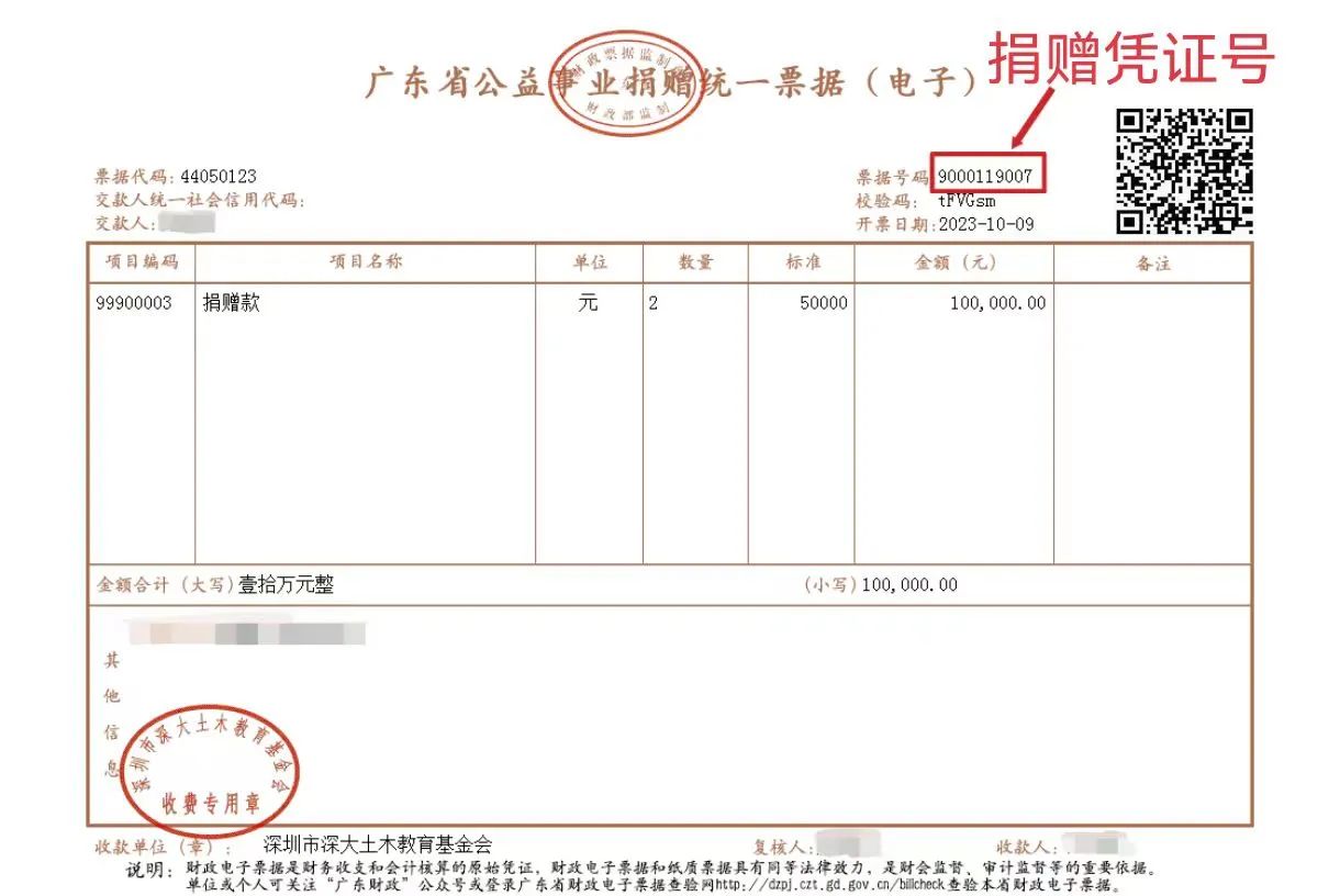 在此,我们特别提醒:2024年度向深圳市深大土木教育基金会捐赠的爱心人士,可在本次个人综合所得汇缴时,填报公益性捐赠扣除的具体信息,享受税前扣除,减免个人所得税。