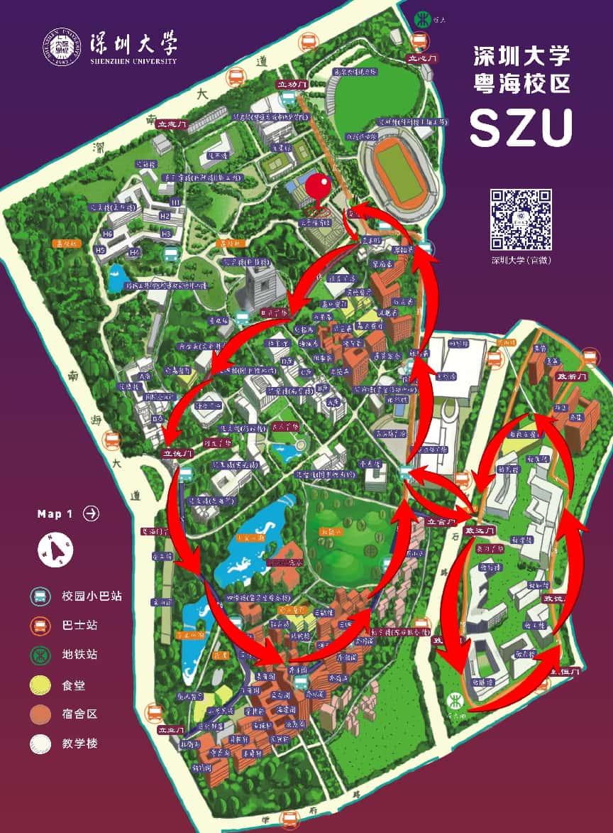 元平体育馆→汇星楼→立德门(西门)→文山湖→乔木阁→杜鹃山→南区天桥→致腾楼→致工楼→夏筝(南区宿舍)→南区天桥→南区运动广场→聚翰斋→元平体育馆