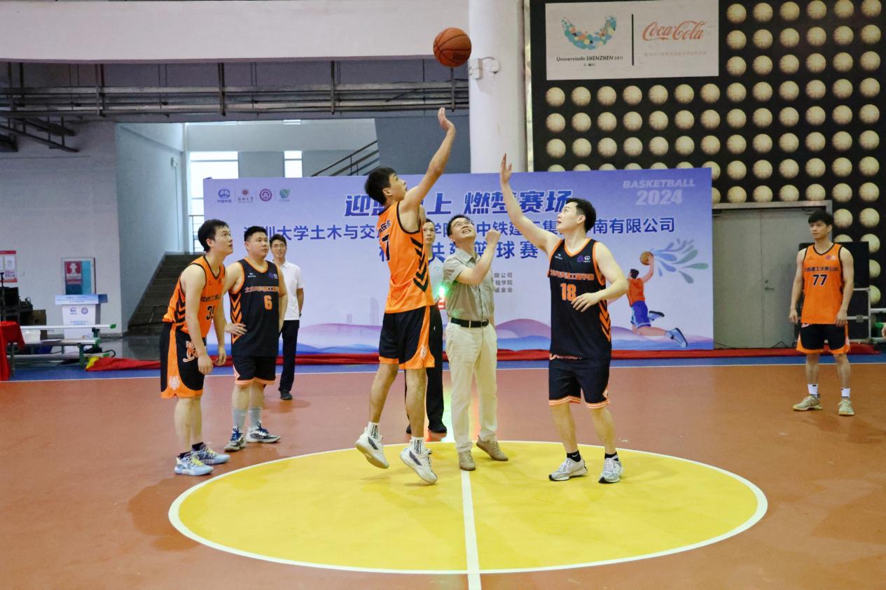 中铁建工集团华南有限公司总会计师罗文彬和深圳市深大土木教育基金会秘书长丁小波为篮球比赛揭幕赛开球。