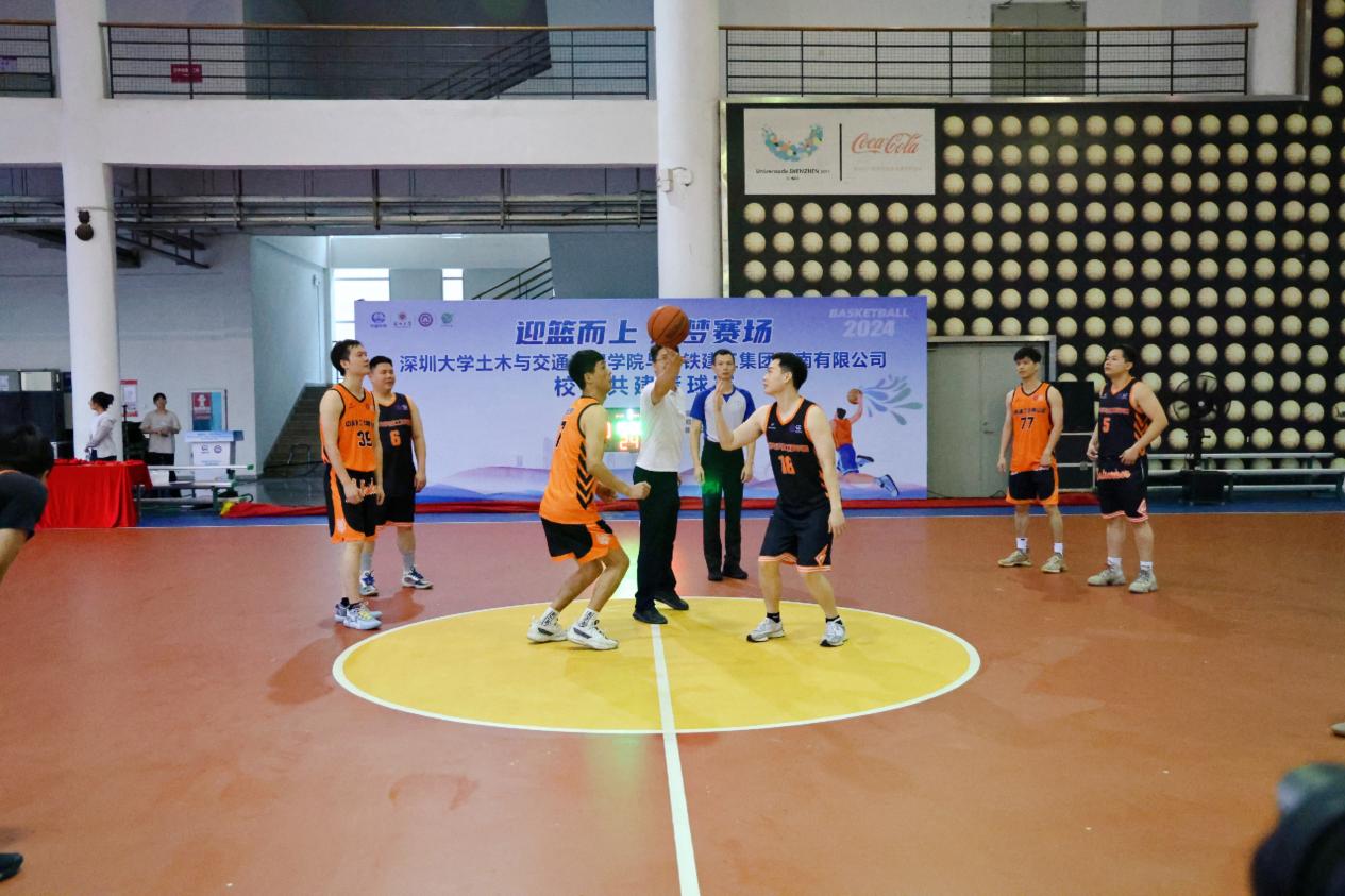 比赛正式开始!在本次篮球友谊赛中,中铁建工集团华南有限公司派出了两支实力强劲的职工队伍,深圳大学土木与交通工程学院则派出了一支校友队伍和一支在校研究生队伍。