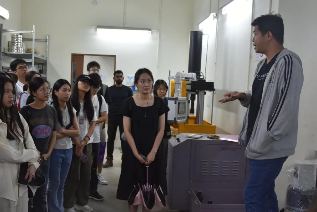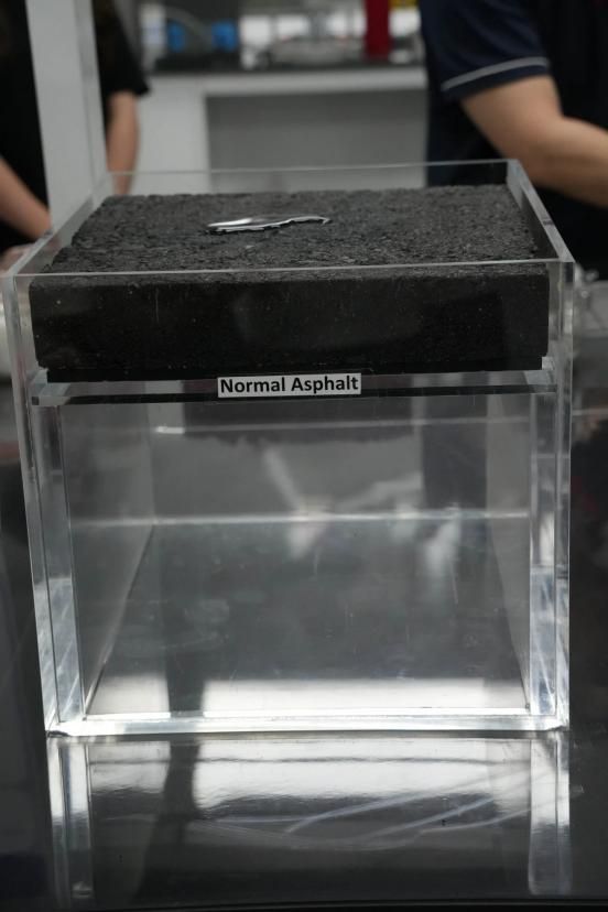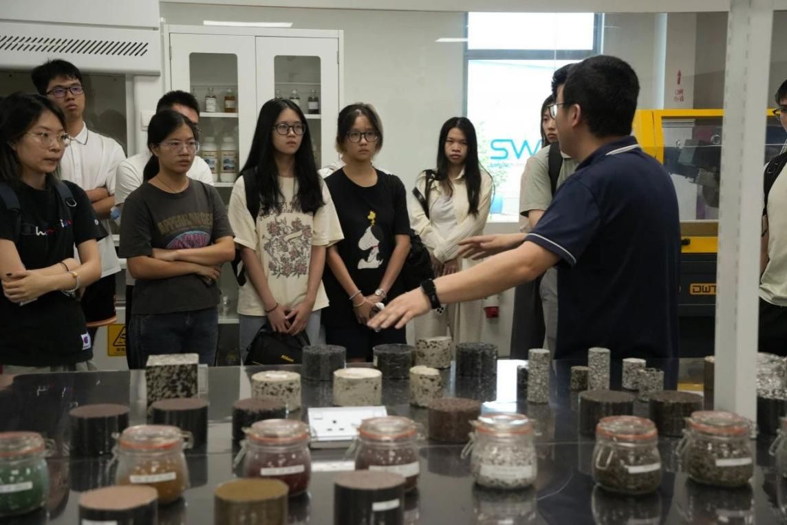 除了理论知识的学习,访学团还前往了三和沥青实验室,学习不同沥青和骨料的种类。左右滑动查看沥青实验图集同学们在现场积极参与交流,往普通沥青和特殊的透水沥青里倒水,可明显观察到后者将水分完全吸收了;两名同学拉伸沥青混凝土,新加坡首次将该材料用于机场跑道,沥青混凝土具有极强的延展性和弹性,可以看到在两位同学拉伸完后,该材料回缩一半。