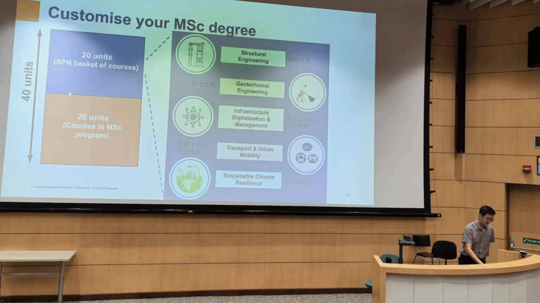 史超老师向访学团成员们介绍了NTU土木与环境工程学院的师资力量、科研研究方向与项目、本硕博课程的设计和培养目标和未来发展方向。着重介绍一下课程设计以及相关的科研方向。