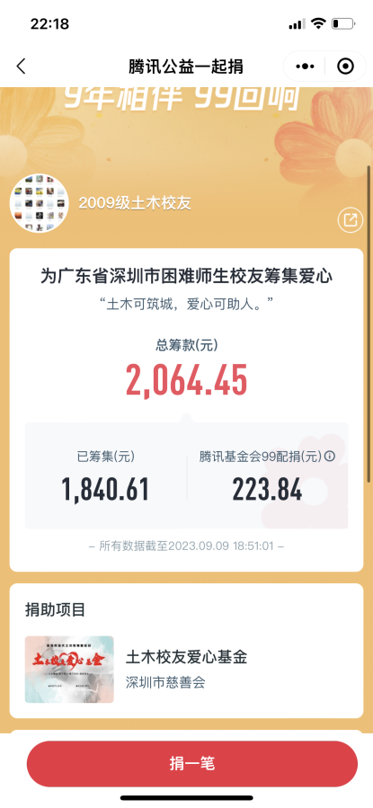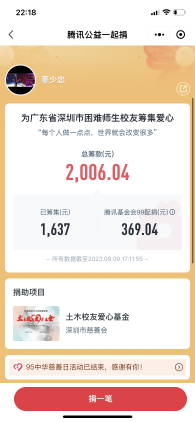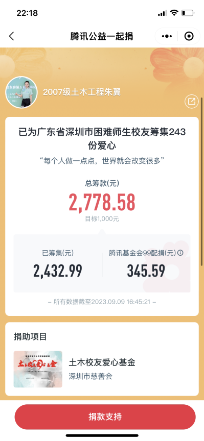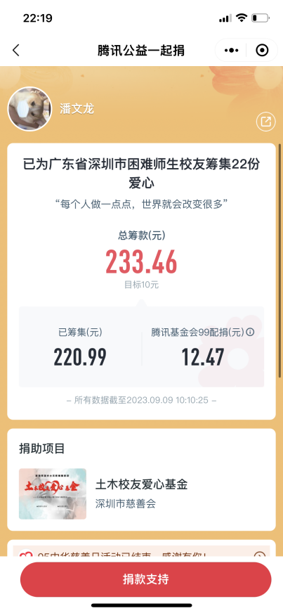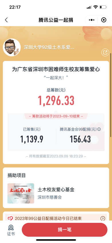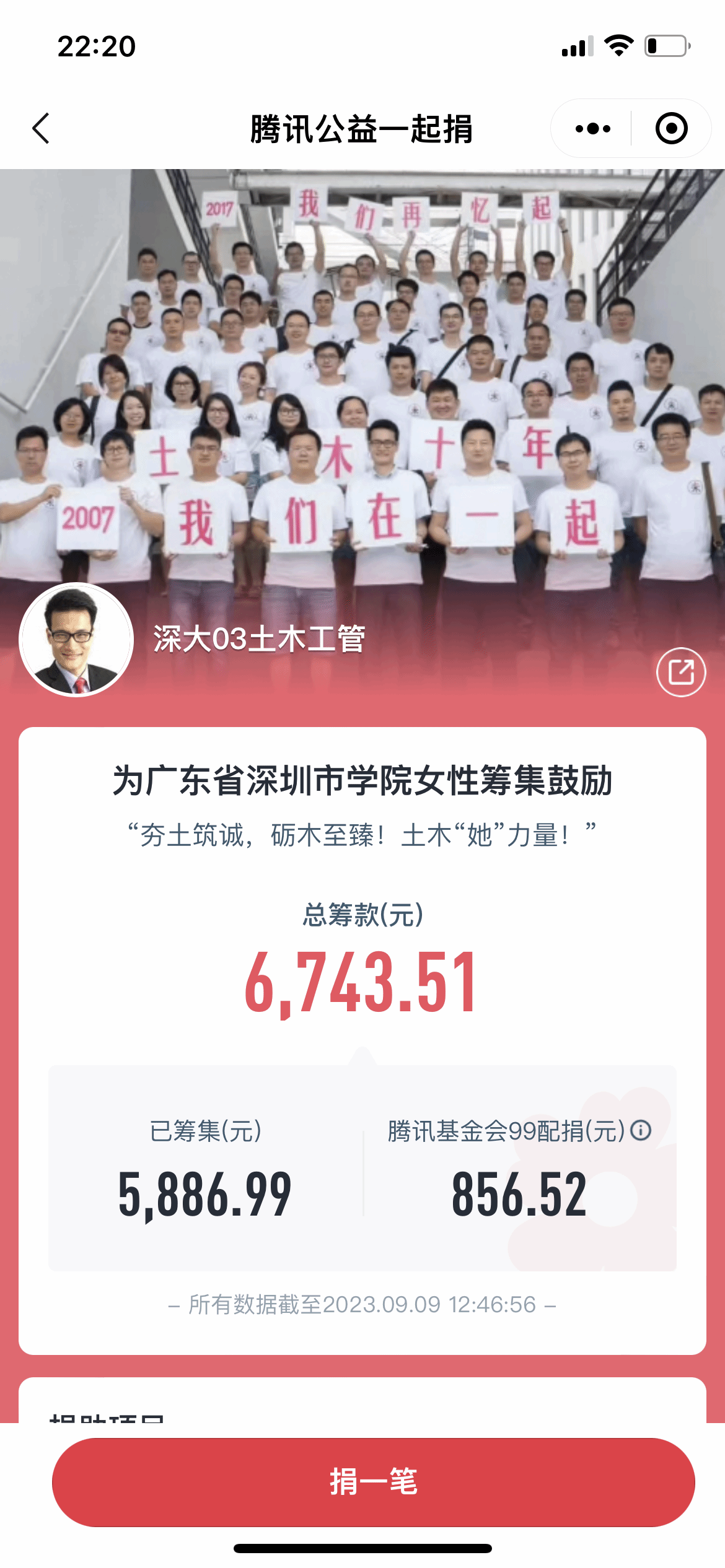 2023年99公益日已落下帷幕,由深圳市深大土木教育基金会、深大土木与交通工程学院校友会发起的“土木校友爱心基金”和“她力量互助基金”爱心捐款项目在这三天时间里,得到了大家的鼎力支持。截至9月9日19时,共有1489人次参与了捐款,39位爱心人士团队组建队伍发起了一起捐,募得总额达60880.27元,其中获得腾讯公益配捐8135.64元。