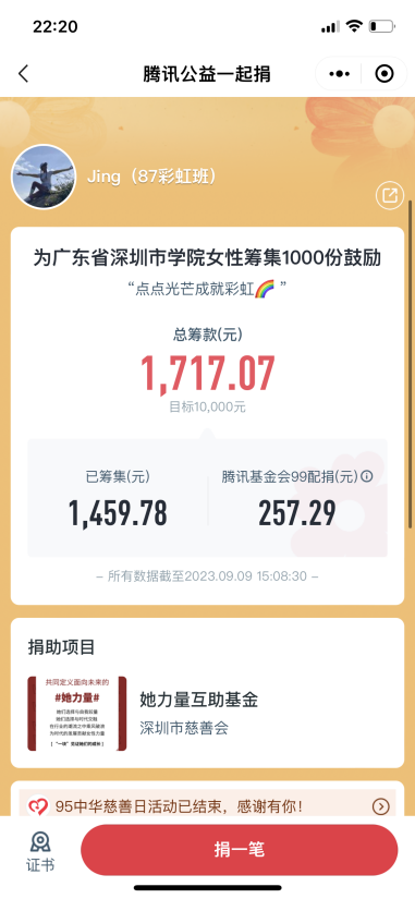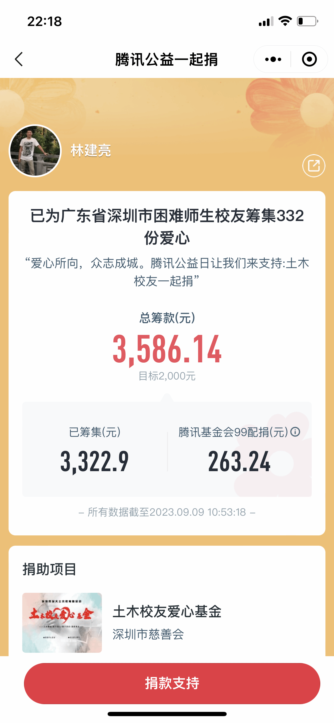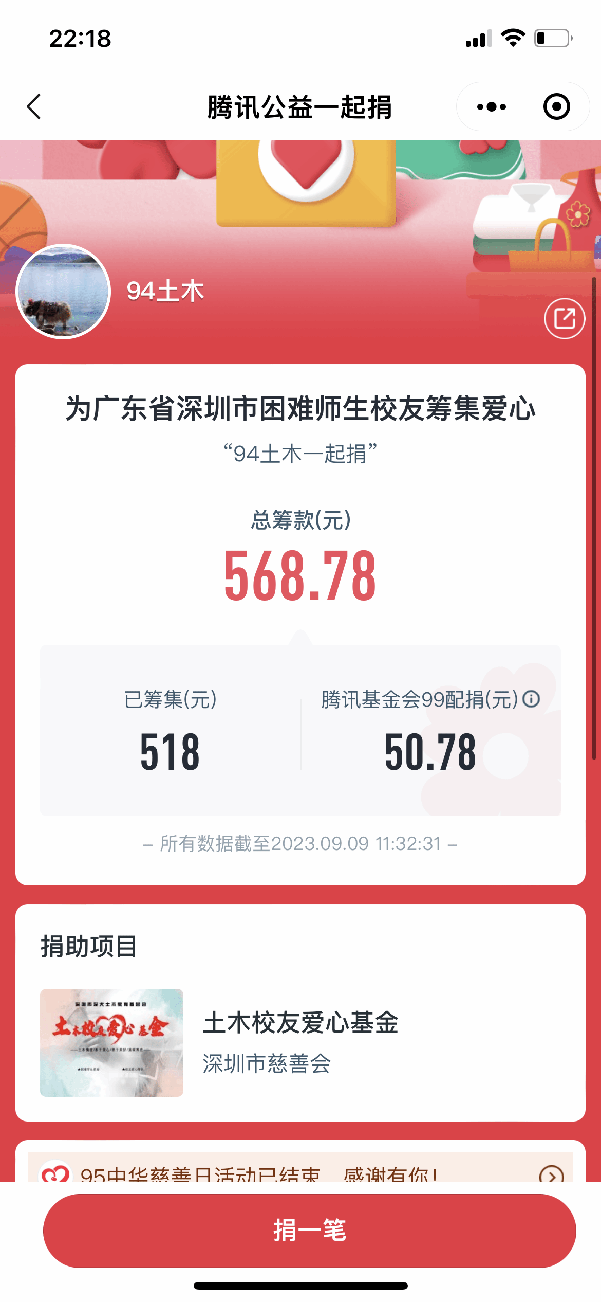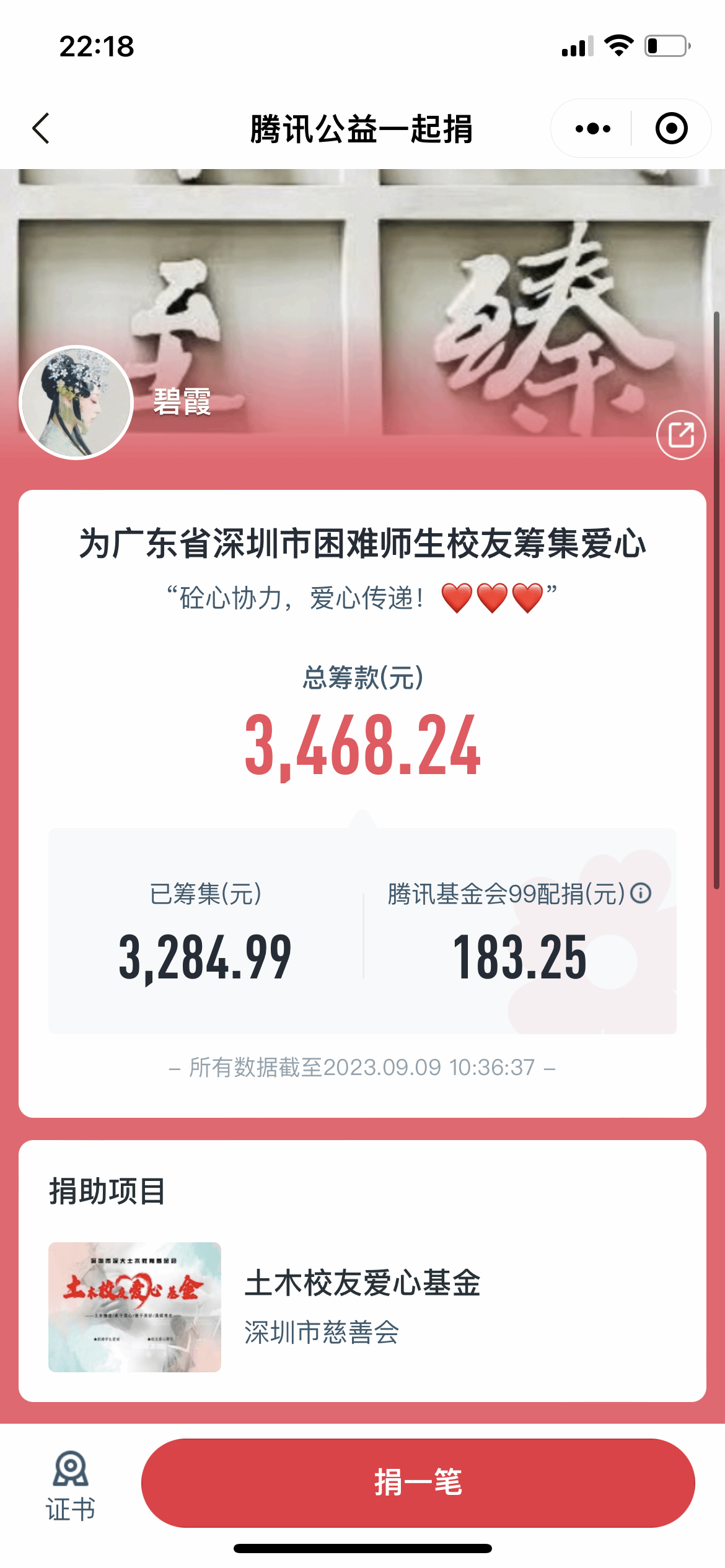 2023年99公益日已落下帷幕,由深圳市深大土木教育基金会、深大土木与交通工程学院校友会发起的“土木校友爱心基金”和“她力量互助基金”爱心捐款项目在这三天时间里,得到了大家的鼎力支持。截至9月9日19时,共有1489人次参与了捐款,39位爱心人士团队组建队伍发起了一起捐,募得总额达60880.27元,其中获得腾讯公益配捐8135.64元。