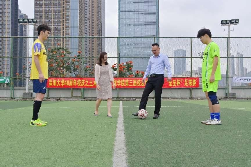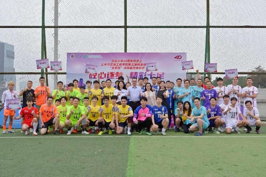 4月22日下午4时30分,深圳大学40周年校庆之土木与交通工程学院第三届校友体育节“全至杯”足球赛开球仪式在粤海校区运动广场天台足球场隆重举行。