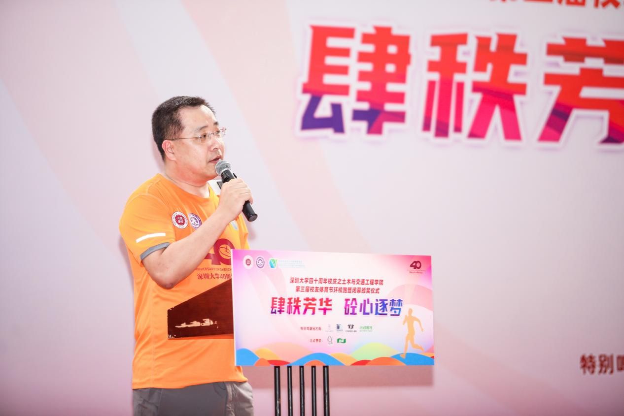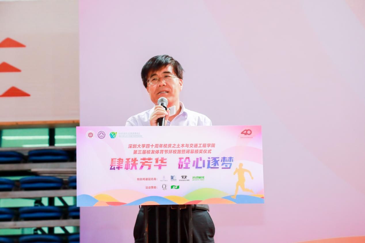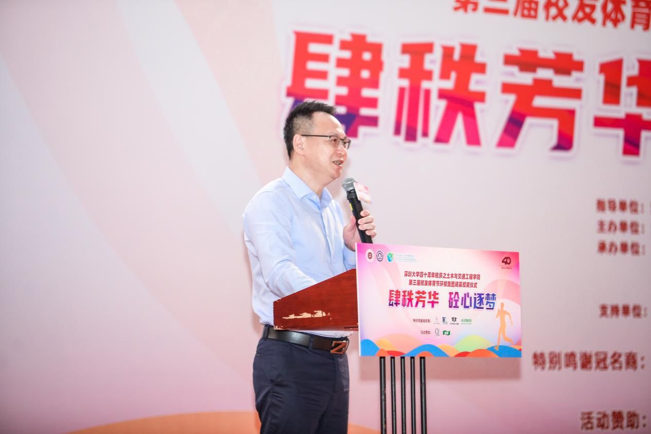 学院校友会代理会长、深圳市深大土木教育基金会理事、海石集团董事长、1996级校友潘海飞代表校友会发言,他表示,本次体育节的圆满成功,离不开所有领导、嘉宾的鼎力支持,离不开校友们和校友企业的慨赠助力,更离不开全体深大土木人齐心协力、集中力量办大事的使命感和责任感。