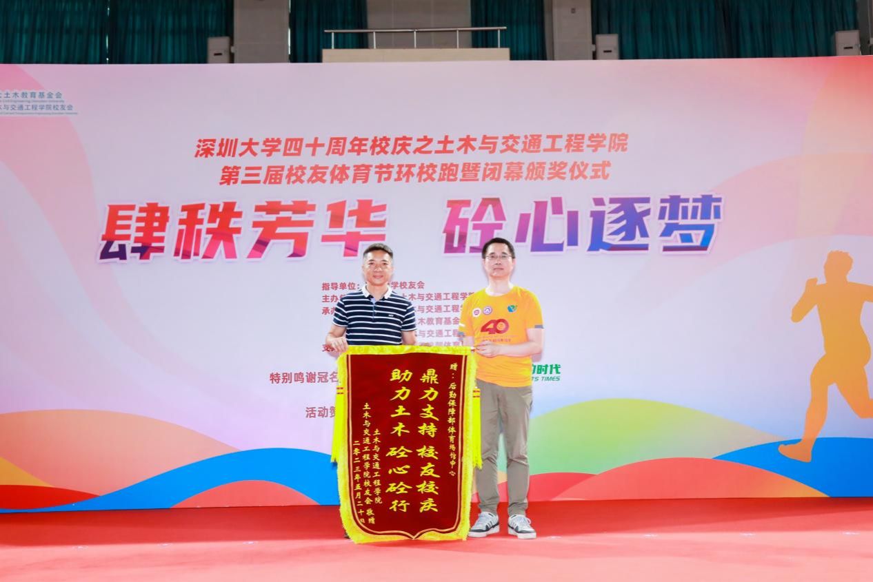 颁奖仪式上,为感谢学校后勤保障部场馆中心对本届体育节赛事的大力支持,学院校友会秘书长、深大土木教育基金会秘书长丁小波向场馆中心赠送锦旗,后勤保障部副主任潘世炜上台接受锦旗赠予。