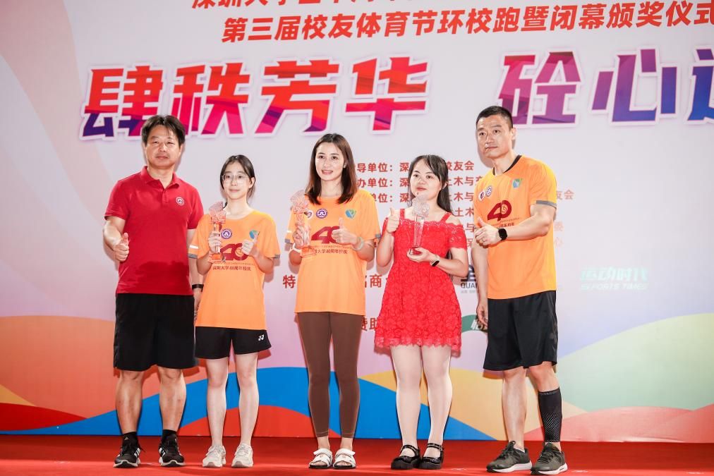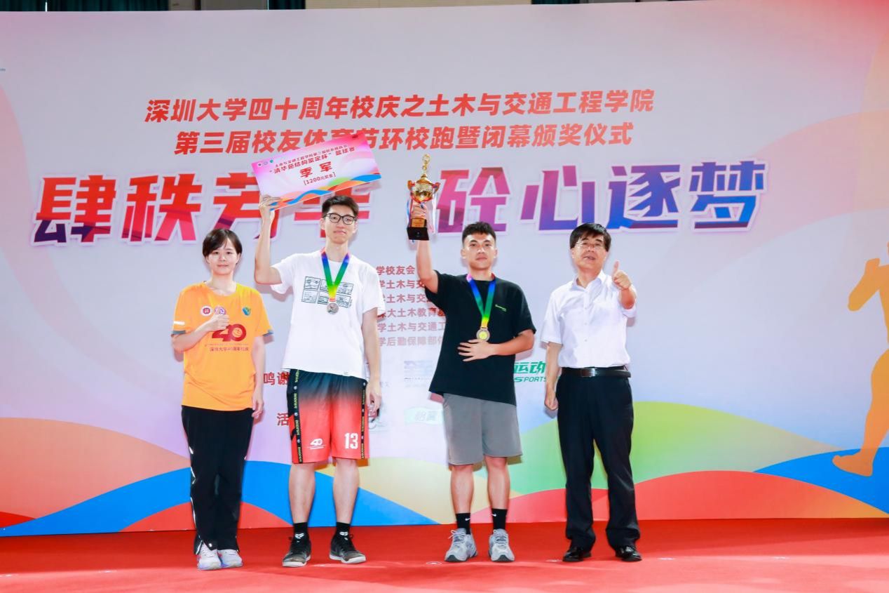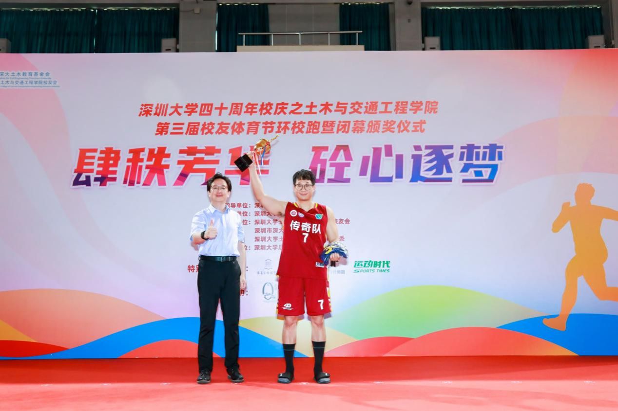 深圳大学副校长汪永成和篮球冠名赞助商、清华苑结构鉴定总经理、1998级校友林爱莲为本届体育节篮球比赛冠亚季军颁奖。