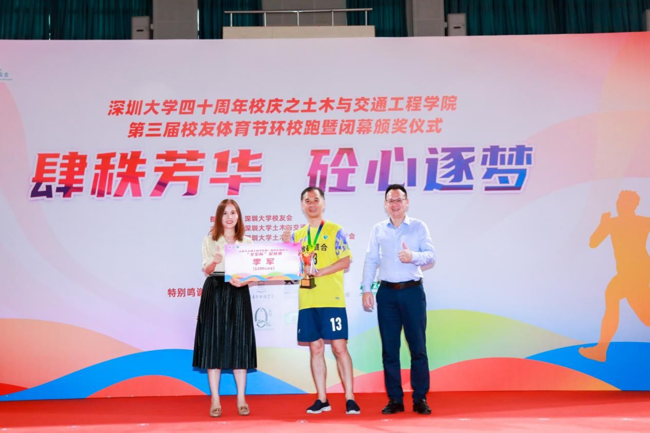 学院校友会代理会长、深大土木教育基金会理事、海石集团董事长潘海飞和活动赞助商、鑫祺建筑设计咨询有限公司总经理、2007级校友郑秦峰为本届体育节乒乓球比赛的获奖选手颁奖。