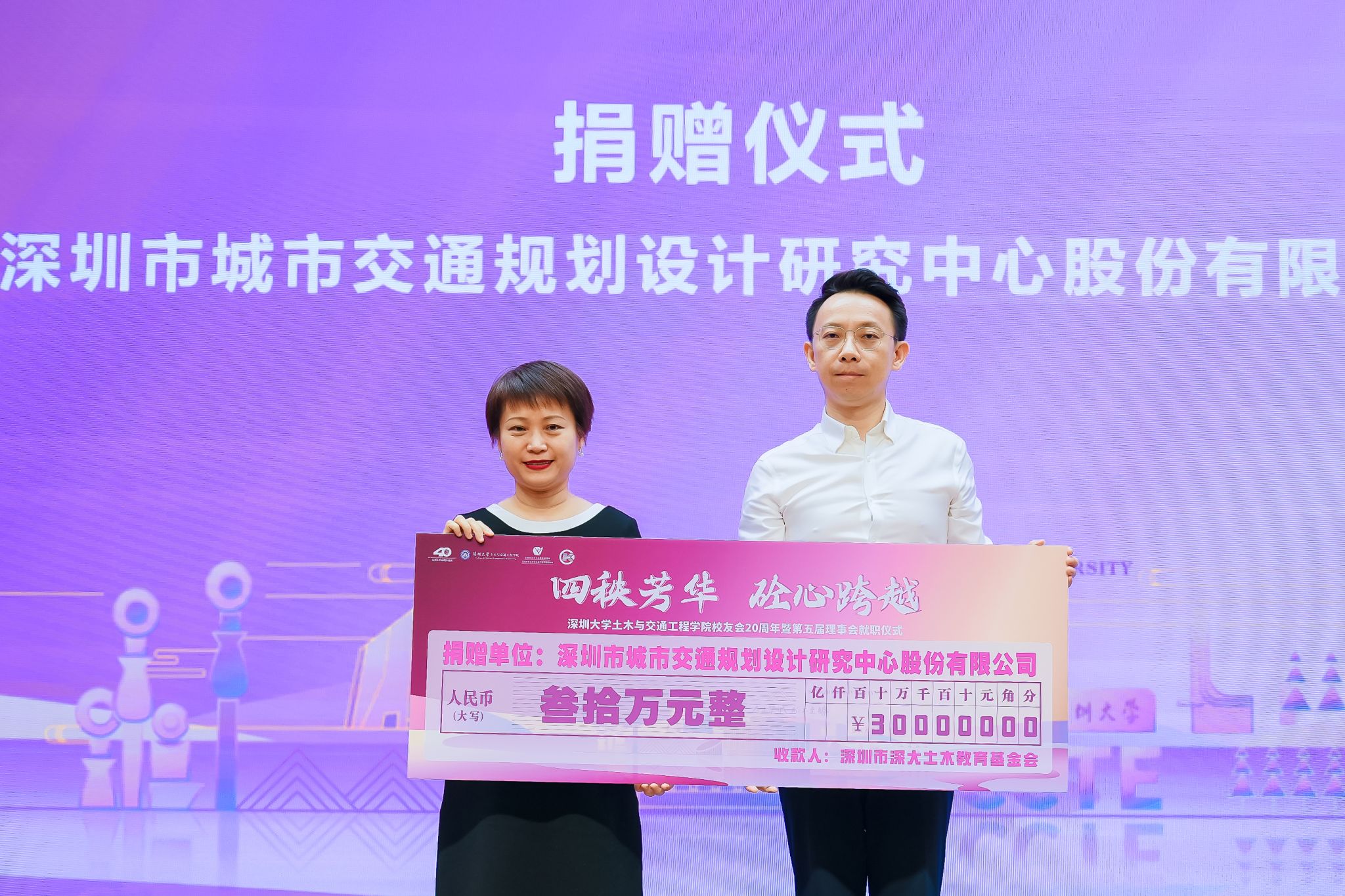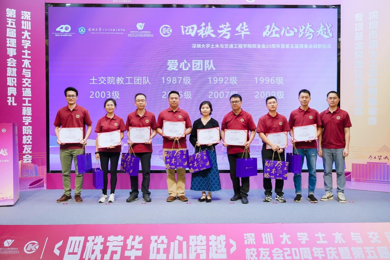 大会期间,主要举行了土交院校友会第五届理事会会长和理事授牌仪式、爱心企业捐赠仪式、正中关爱助学金颁发仪式、深圳市深大土木教育基金会捐赠感恩环节。