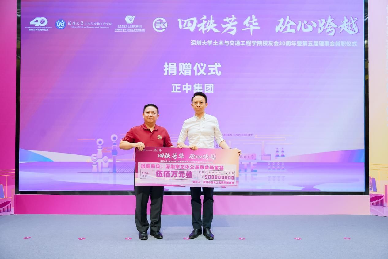一直以来,学院和校友会、基金会的发展得到了优秀校友们和社会各界的大力支持。今年,深圳市深大土木教育基金会收到了多家企业的爱心捐赠。正中集团向深圳市深大土木教育基金会捐赠500万元;海岸集团捐赠500万元;深圳达实智能股份有限公司捐赠40万元;深圳市城市交通规划设计研究中心股份有限公司捐赠30万元。
