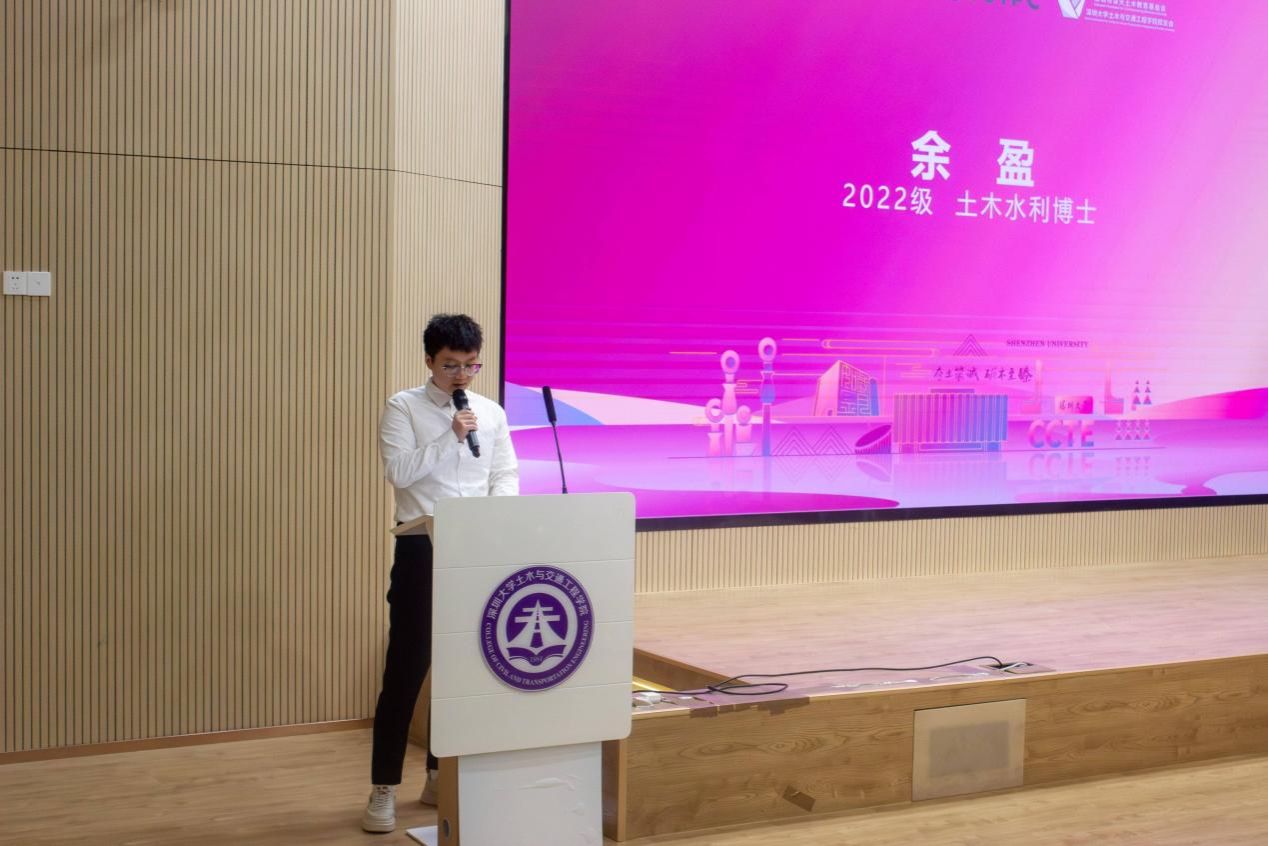 获奖学生代表、2022 级土木水利博士余盈上台发言,他首先代表2025年度10名获得“菁英”奖学金的同学对深圳市城市交通规划设计研究中心股份有限公司、深大土木教育基金会的奖励和学院长期以来的培养表示感谢,并表示将以这份荣誉为动力,精进专业、勇担使命,用所学知识为行业发展与社会建设贡献青春力量。