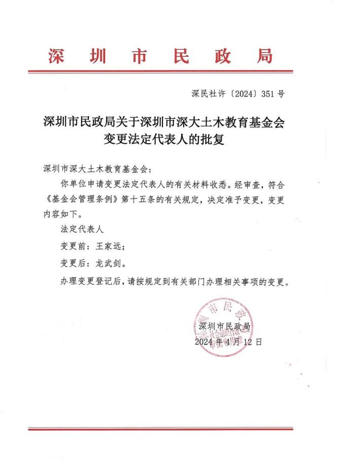 2024年4月12日,经深圳市民政局审查,批准我基金会法定代表人变更申请,现将变更情况公告如下: