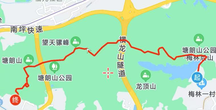��徒步路线:梅林文体中心-梅林山郊野径三号登山口-梅林山郊野径二号登山口-梅林山郊野径一号登山口-山泉水口-梅林水库绿道涂鸦墙-储云屿-无暑平台-无暑清凉-双峰竟秀-茶香径登山道-塘朗山顶峰-栊翠亭-青云台-荔云登山道-塘朗山公园龙珠门
