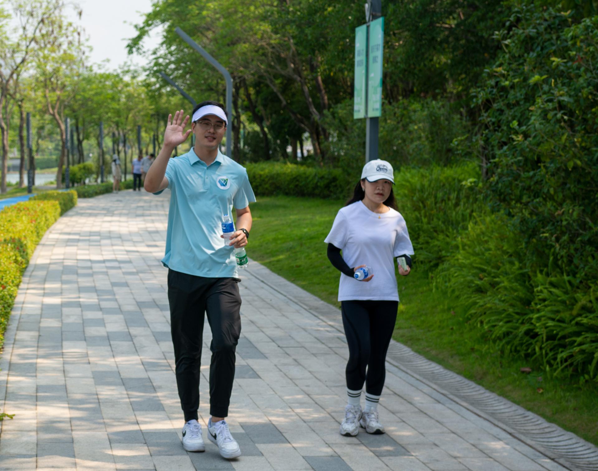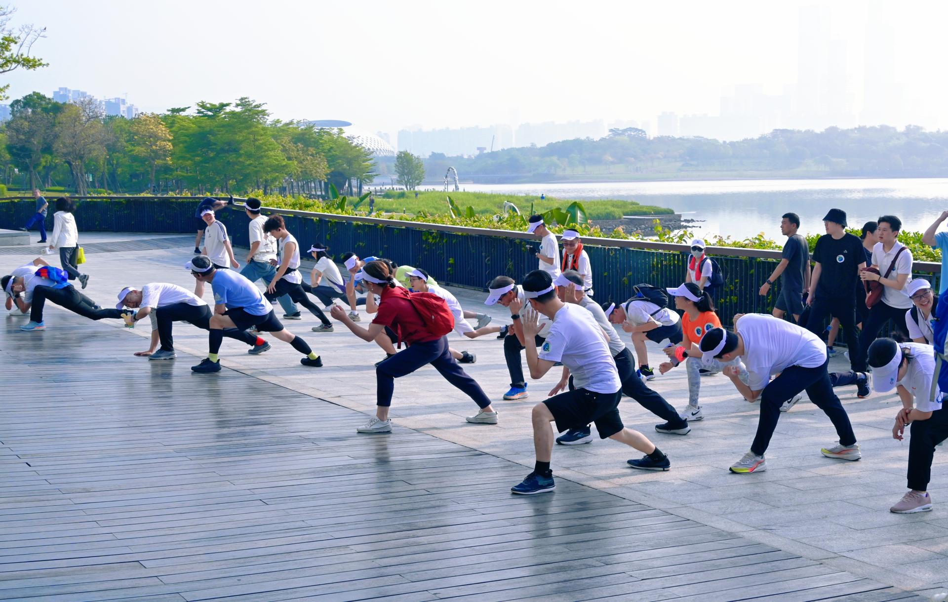 清晨,在阳光的沐浴中,老师们、校友们、同学们陆续到达深圳人才公园求贤阁签到,随即开始进行热身活动,为接下来的徒步做好充分准备。