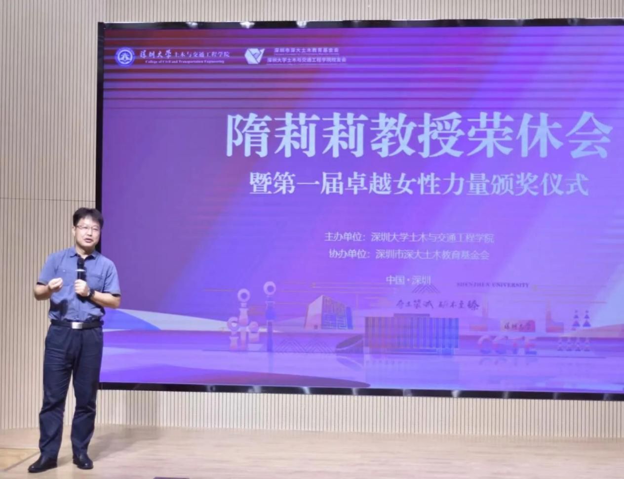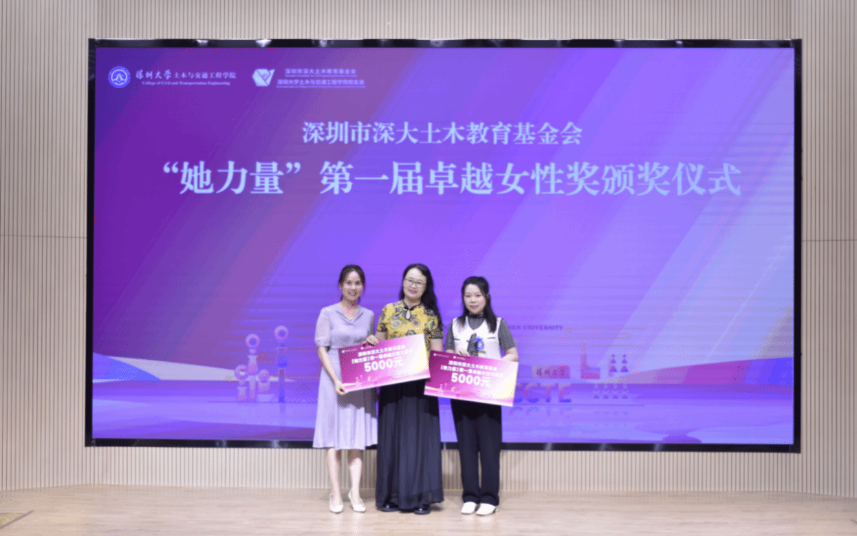 由深大土木教育基金会“她力量”基金组织开展的第一届卓越女性力量奖评选最终获奖者名单也在本次荣休仪式上揭晓,隋莉莉老师和胥晴校友凭借其在工程实践与管理及科技研究领域的卓越成就以及独有的女性魅力获得了评审委员的一致高度认可。左英姿书记为两位获奖者颁发了奖杯与奖金。这个奖项不仅是对她们在事业上所取得的辉煌成就的认可,期待她们作为女性榜样,能激励学院每一位女性追求卓越,实现自我价值。